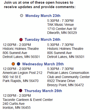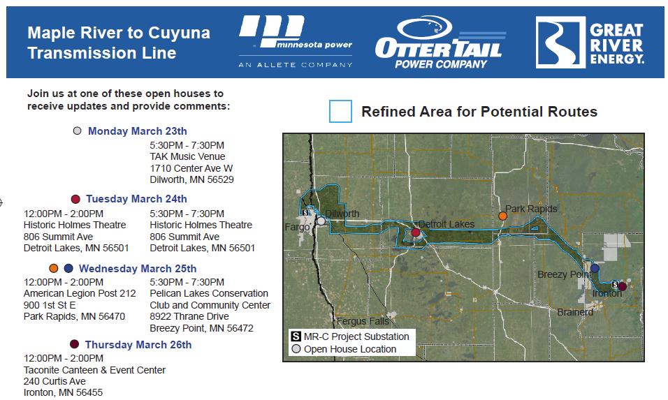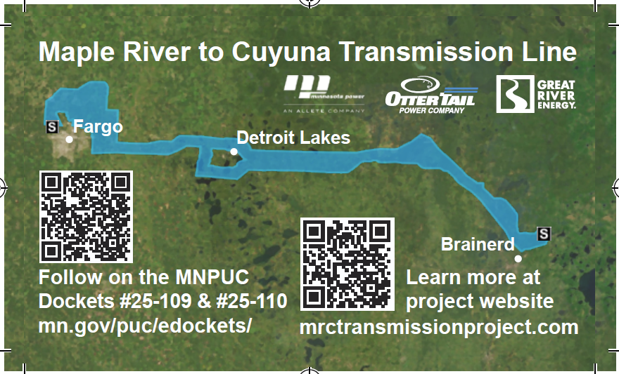 It’s another round of utility applicant open houses for the Maple River to Cuyuna Transmission Line, PUC eDocket CN-25-109. I’m betting they also have the computer stations where you can get a print-out with the corridor and your property!