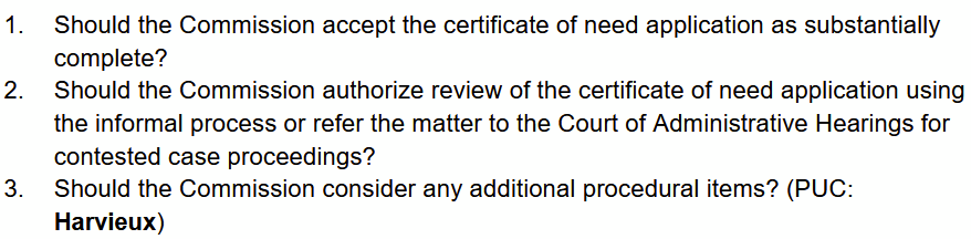 - Referral to Court of Administrative Hearings for a contested case — necessary for a thorough review of the applications and a robust record that can support a Commission decision! At the very least, joint contested case for Certificates of Need – CN-25-117 and CN-25-121. Contested issues are cost, cost increase, cost/benefit analysis (whether the project provides more benefit than cost), and system alternatives.
