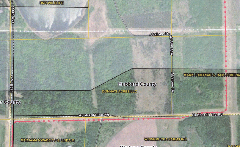 Now, it’s transmission redux, and this Maple River to Cuyuna, or “MR-C Transmission Project – A Minnesota Power Project,” it’s a 345kV line in northern Minnesota, and has a corridor right over the Andersen property. It’s a pinch point in the map, just south of Park Rapids, west of Hwy 71, with transmission directly to the north, the dotted white line at the south end of a WMA; a transmission to the south just across the dirt road, Hubbard County Line Road, the red dotted line… and where it goes north on the right, that’s parallel to a pipeline!