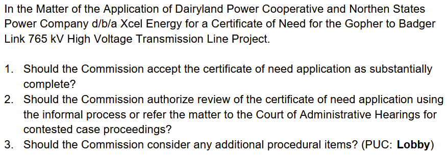 They also questioning whether North Route Group and NO765MN have standing. Well, I’d guess that’s no different than the “Joint Intervenors” and “LIUNA” and MISO and whoever else might request intervention. And don’t forget the Commission’s public participation mandate in Minn. Stat. 216I.16.