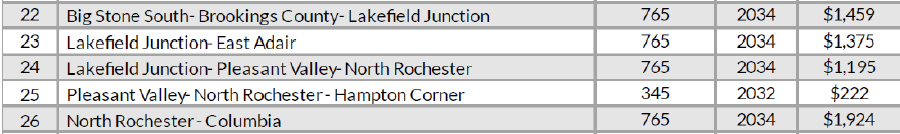 This stretch across southern Minnesota, with a frolic and detour to “North Rochester” substation located north of Pine Island, and back again, is a compilation of MISO‘s Tranche 2.1 projects 22, 23, 24, 25, and 26. MISO 22, 23, 24, and 25 are in the CN-25-117 consolidated dockets, and MISO 26 is in the consolidated CN-25-121 docket. MISO 22, 23, 24, 25, and 26 are $6,175 BILLION dollars — the dollar amount alone should trigger extensive review: