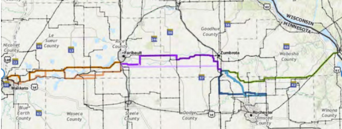 The blue part on the left, from Big Stone-Brookings, through Lakefield Junction, to Pleasant Valley, and up to “North Rochester” which is actually north of Pine Island is what’s at issue tomorrow: