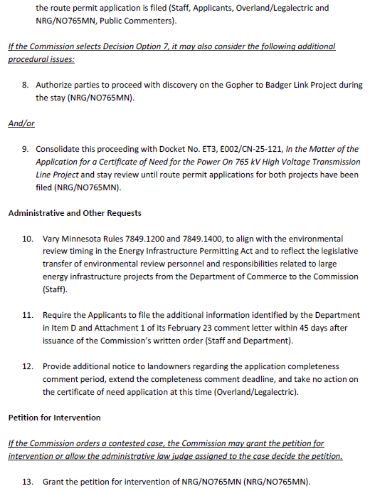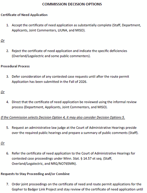 Little, but important, win – avoided “informal process” of #4, but maybe it’ll come up again, though #3 was clear on Thursday. CN-25-117 did move forward to contested case, and this is likely too, so it was said. Littler win — #3 Certificate of Need review is on hold until the route application is filed in the fall, and then we address process again (would have rather had the application referred for a contested case NOW, but oh well…) Another positive development is #11, that applicants will have to provide the info that Commerce DER wants within 60 days of the Commission’s written order. That’ll give us something to chew on.