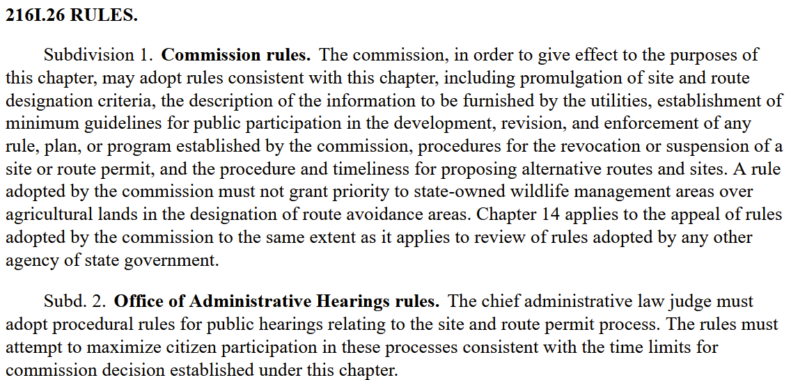 Note the use of “may,” which is way too much wiggle room: “The commission, in order to give effect to the purposes of this chapter, may adopt rules consistent with this chapter…” Knowing how they avoided rulemaking and tossed the years of work in docket R-12-1246, “may” is just not adequate. I can’t find that any rulemaking has begun, and I’d nosed around about it and no return call… no surprise. It seems to be a “Rules? We don’t need no stinkin’ rules!” attitude. Think that’s wise when we’re looking at Need and Routing for the biggest transmission lines in Minnesota history? As Shawn would say, “Goes to show you don’t think!!!!!”