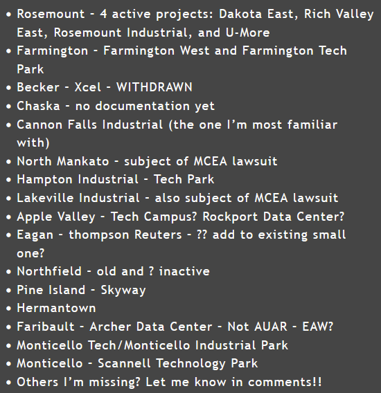 Minnesota Center for Environmental Advocacy has been doing a great job challenging some of the 17 (now maybe more?) data centers proposed in Minnesota. Thus far, the ones I know of are, as of September: