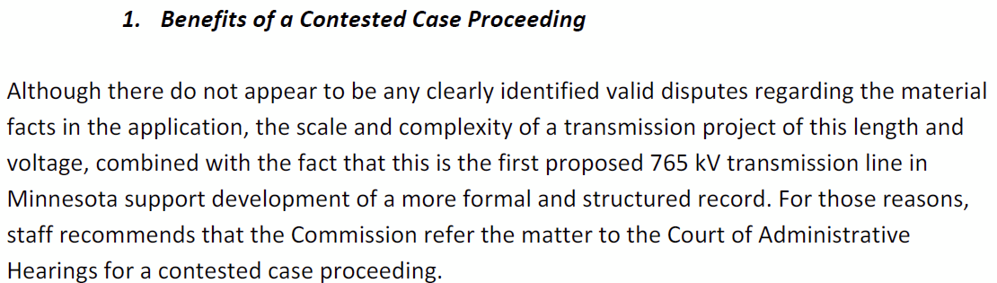 They also questioning whether North Route Group and NO765MN have standing. Well, I’d guess that’s no different than the “Joint Intervenors” and “LIUNA” and MISO and whoever else might request intervention. And don’t forget the Commission’s public participation mandate in Minn. Stat. 216I.16.