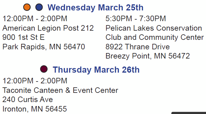 It’s another round of utility applicant open houses for the Maple River to Cuyuna Transmission Line, PUC eDocket CN-25-109. I’m betting they also have the computer stations where you can get a print-out with the corridor and your property!