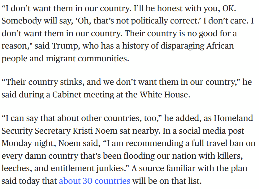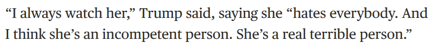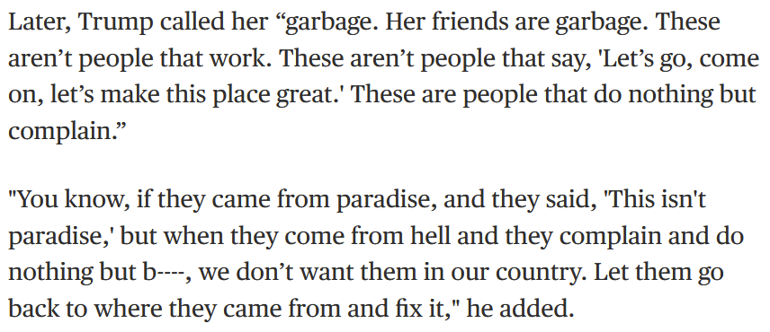 Claims that Somali immigrants “contribute nothing,” “have caused a lot of trouble,” and repeatedly calling Somalis “garbage,” including Minnesota Rep. Ilhan Omar.